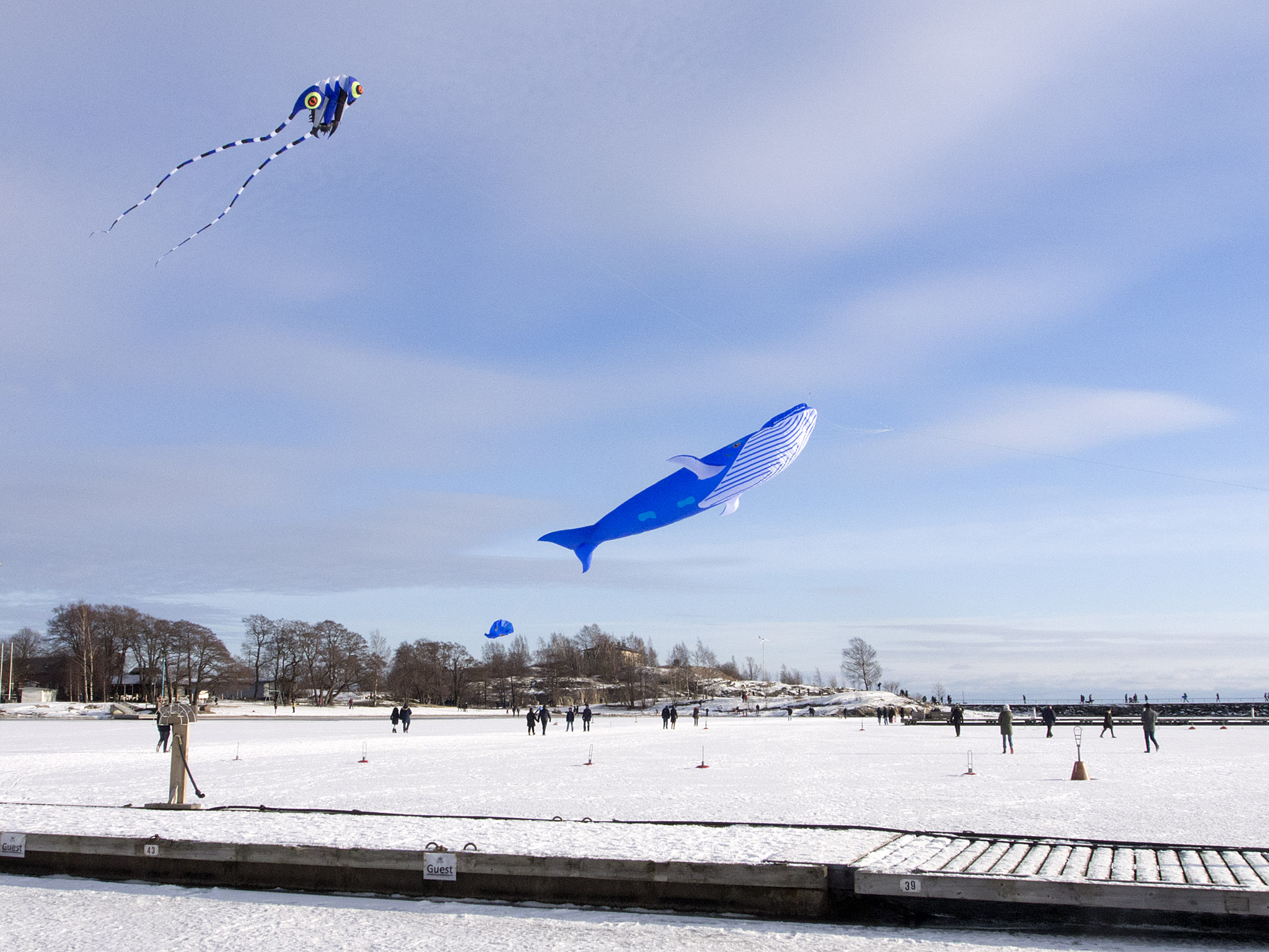 Merisatama on keväisillä jäillä suosittu ulkoilupaikka, mutta jäälle mahtuu myös lennättämään. Kauniilla säällä yleisöä riittää.